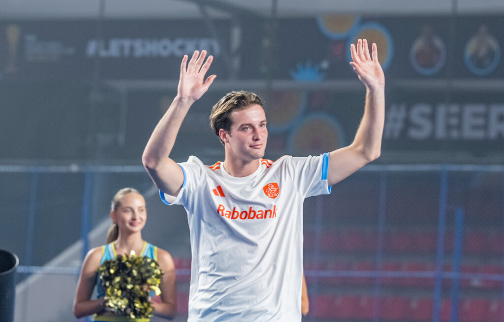 Op het podium in het Mayor Radhakrishnan Hockey Stadium in Chennai wordt Casper van der Veen volop in de spotlights gezet. Foto: WorldSportPics/Ewout Pahud de Mortanges