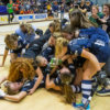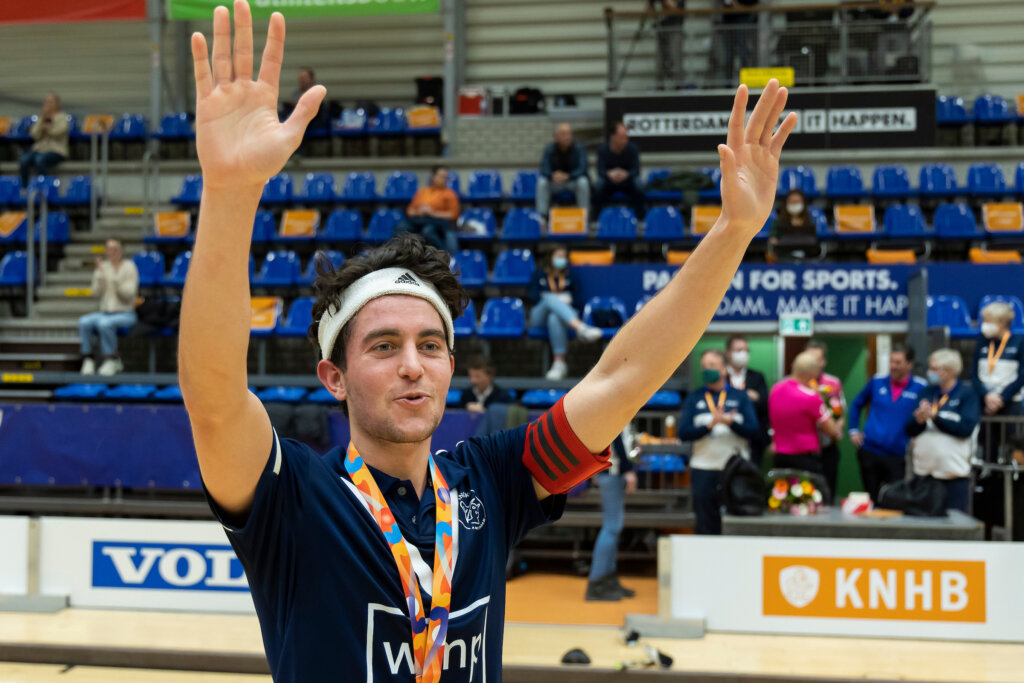 Het Topsportcentrum Rotterdam was niet helemaal vol door de coronarestricties. HDM kwam op voorsprong. Pinoké liep vervolgens uit naar 3-1 en 4-2. ‘Het verbaasde mij dat ze ondanks de achterstand geduldig bleven met druk zetten’, zegt Merkus. Maar in de zaal kan het snel keren. HDM knokte zich terug naar 4-4. ‘Dan schieten er allerlei scenario’s door je hoofd, maar ik had nooit het gevoel dat we het zouden laten glippen, ook niet als het op shoot-outs aan zou komen.’
