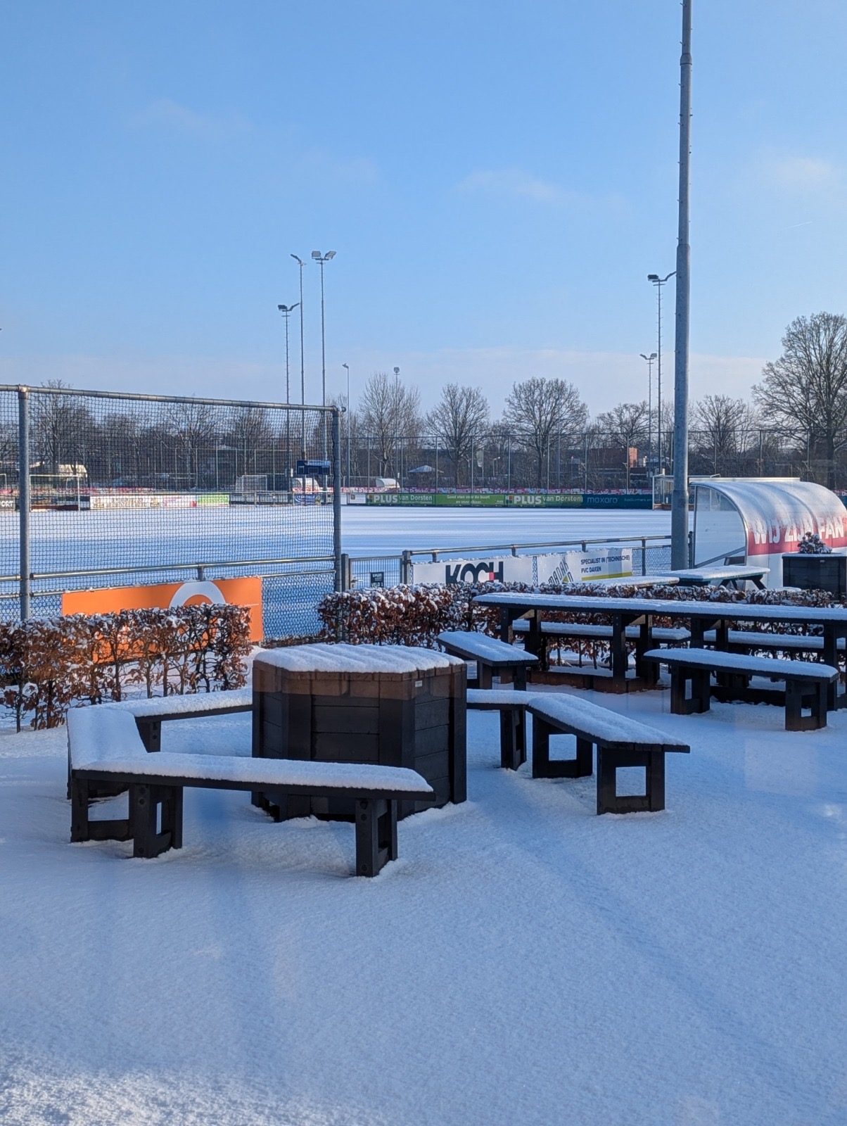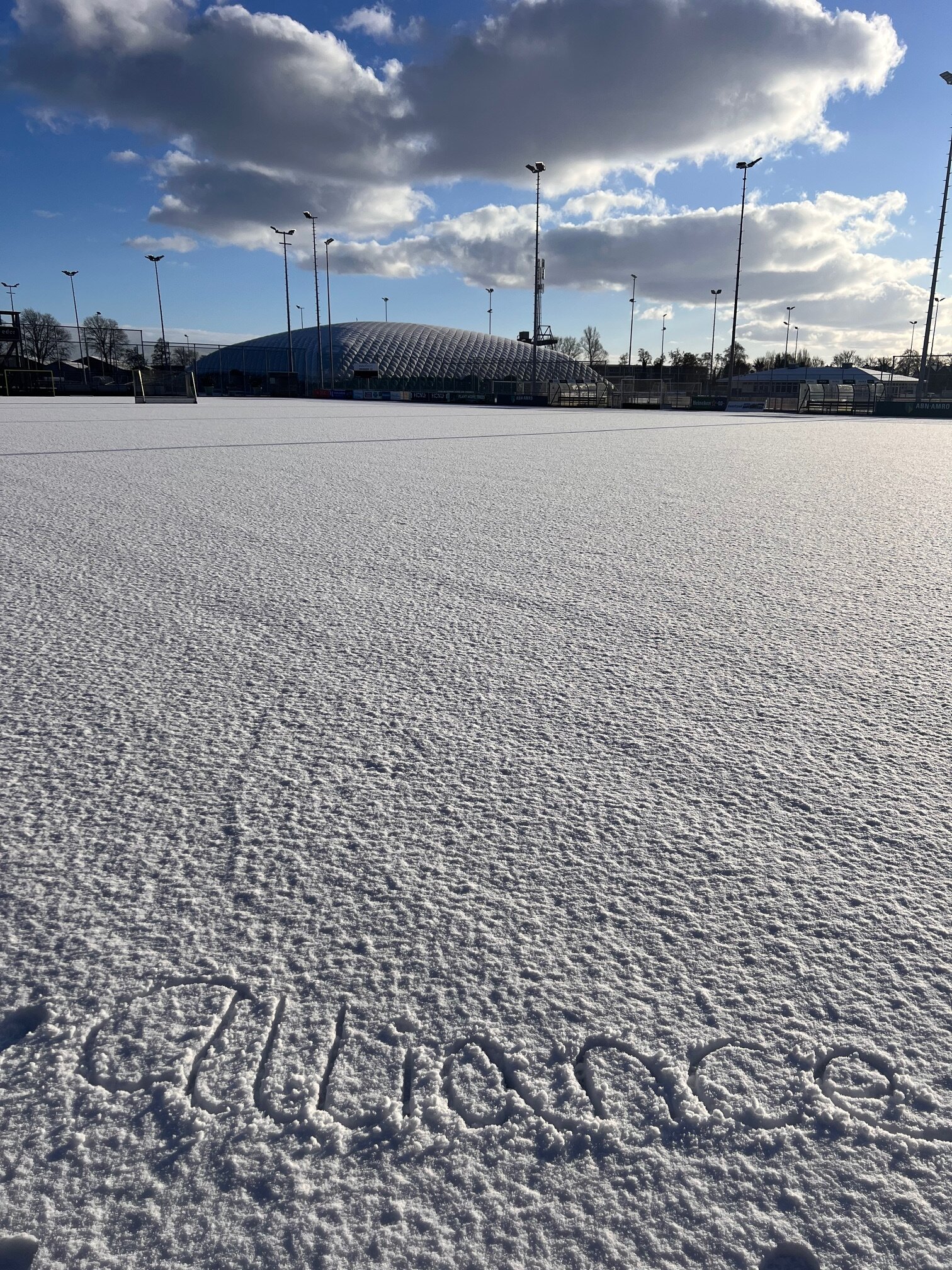 Bij Alliance ligt het hockeyveld er zo bij. Volledig wit en geen voetstap te bekennen.