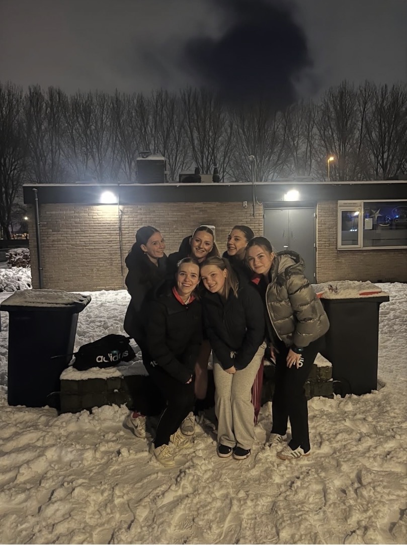 Waar veel teams thuis bleven, ging MO18-1 van HC Pijnacker wél gewoon naar buiten. Na de training sloten zij af met een vrolijk winnaarskiekje in de sneeuw.