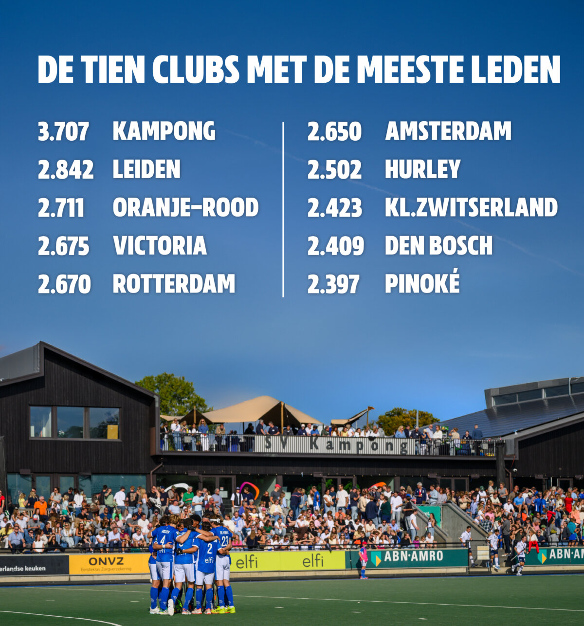 Kampong is ook dit jaar de grootste club van het land, zo blijkt uit cijfers van de KNHB over het afgelopen hockeyseizoen. De Utrechters hadden het afgelopen seizoen 3.707 leden en zijn daarmee de enige club die boven de drieduizend hockeyers zit. Leiden (2.842) en Oranje-Rood (2.711) completeren de top 3.
