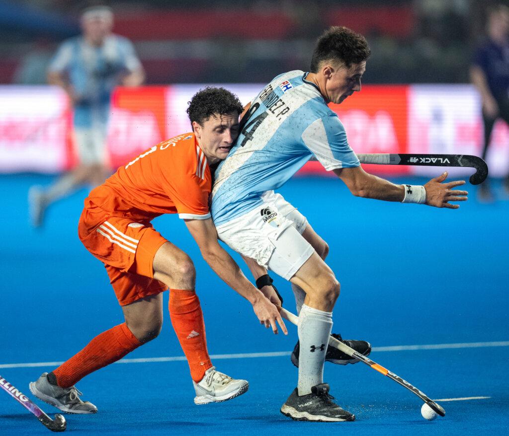Merijn Maas probeert zijn Argentijnse tegenstander de bal te ontfutselen tijdens het kwartfinaleduel op het WK-21 in India. Foto: Ewout Pahud/Worldsportpics