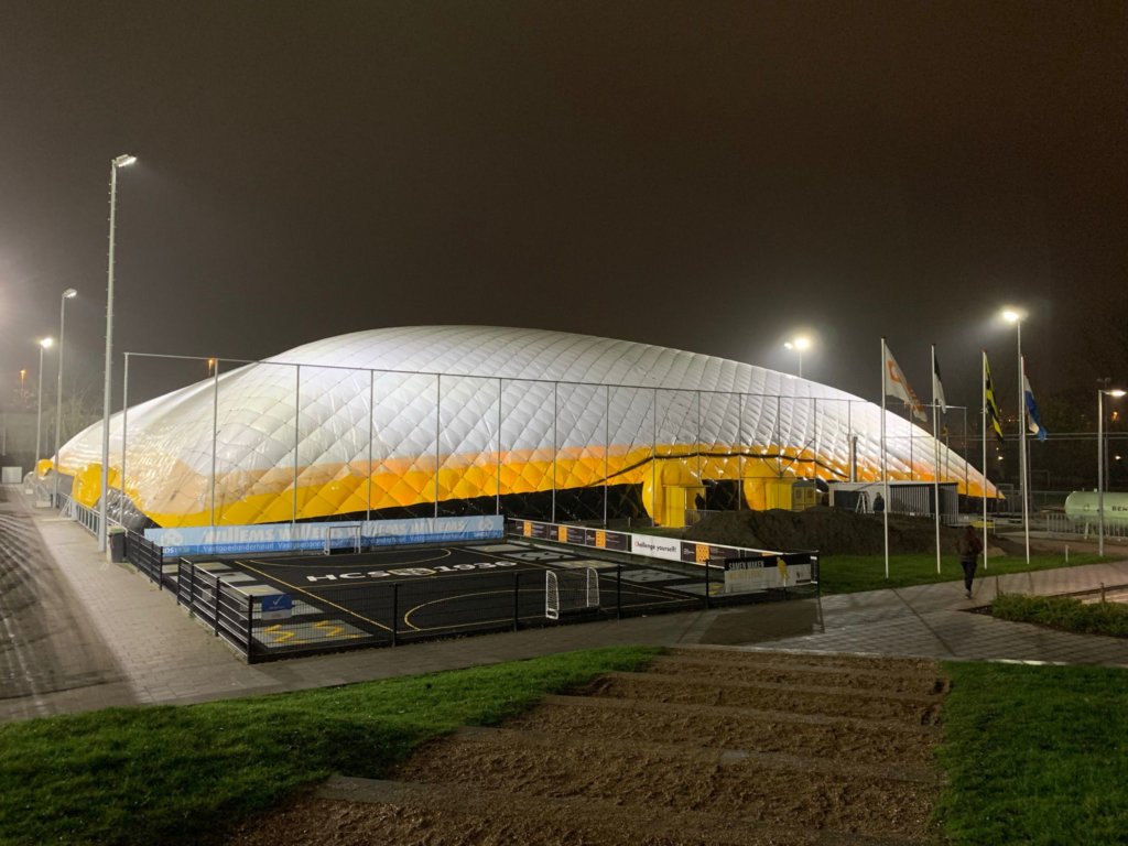Stralend telt De Blaey op zijn vingers het aantal clubs die vanaf dit seizoen voor het eerst een blaashal in gebruik nemen. ‘GHBS… Groningen… Nijmegen… Venlo…’, somt hij op, terwijl hij elke club uitspreekt alsof hij een klein succes viert. Voor hem geldt: hoe meer hallen de lucht in gaan, hoe groter zijn enthousiasme. ‘Al jaren denk ik: nu is de rek er wel uit. Nu is de limiet van het aantal clubs die zich een blaashal kunnen veroorloven wel bereikt. Maar dan – pop, pop, pop – duiken er toch weer clubs op die er één uit de grond stampen. Het blijft prachtig om te zien.’