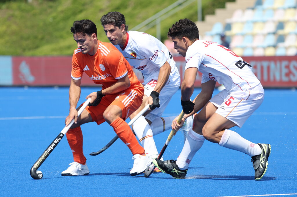 Tijmen Reyenga in duel met Spanjaarden Jordi Bonastre en Joaquin Menini. Foto: Willem Vernes