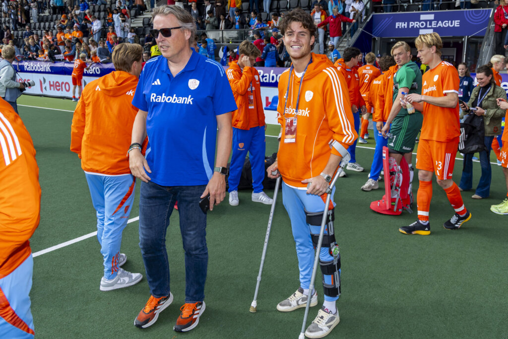 Een ongelukkige botsing tijdens de warming-up afgelopen zaterdag zorgt ervoor dat Oranje-aanvaller Miles Bukkens voorlopig buitenspel staat. Zeker geen Pro League en mogelijk ook geen EK in Duitsland deze zomer voor de spits van Pinoké, die met een grote brace om zijn linkerknie en krukken de wedstrijd van Nederland tegen India (3-2 zege) bekeek in het Wagener Stadion.
