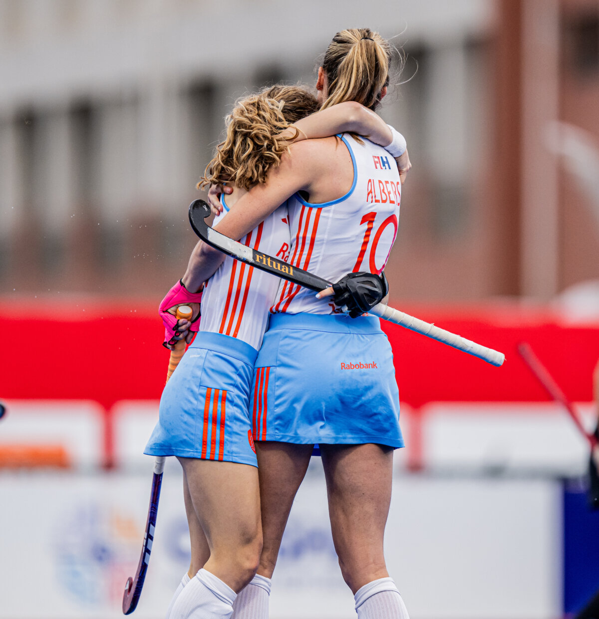 Een knuffel van Eline Jansen voor doelpuntenmaker Felice Albers. Foto: WorldSportPics/Will Palmer.