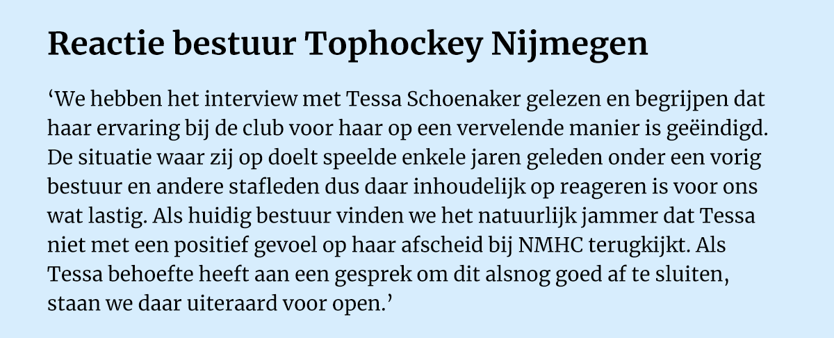 Ze speelde play-offs om een plek in de Hoofdklasse, was op jonge leeftijd al een vaste waarde bij Nijmegen Dames 1 en beleefde intense hoogte- én dieptepunten. Nu, vijftien jaar later, zwaait Tessa Schoenaker af. Langs de lijn, door een zware hersenschudding. Niet met een sportief hoogtepunt, maar na degradatie met MOP naar de Overgangsklasse. En toch: juist in Vught vond ze het plezier terug.