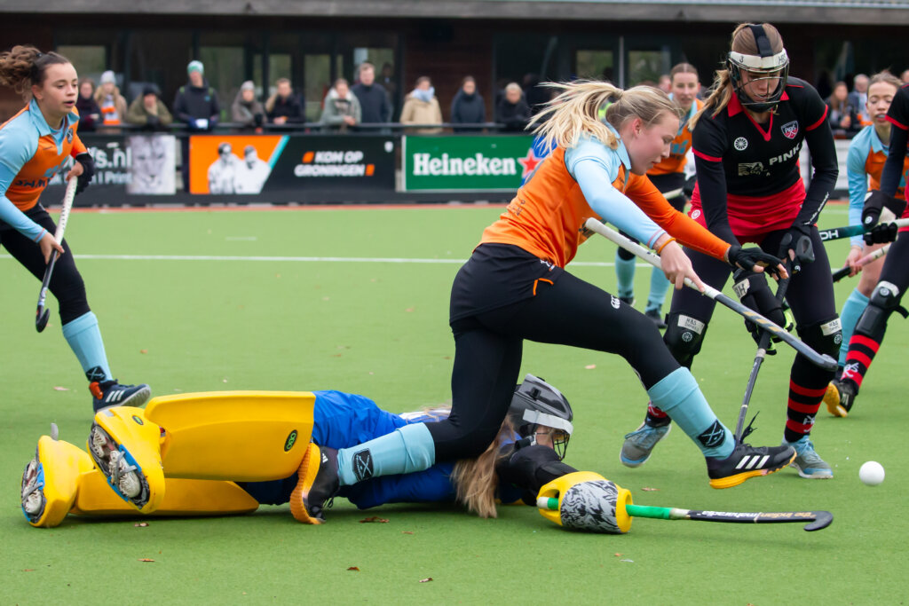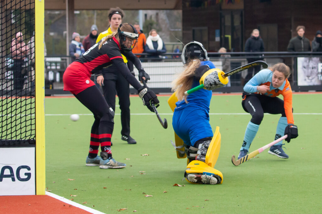 Claire Fischer van Groningen scoort de 1-3 uit een strafcorner. Foto: Jacob Gunter