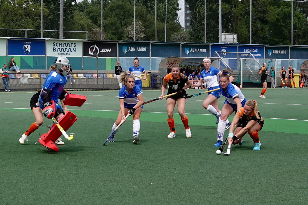 Leonidas liet voor het eerst in vier wedstrijden punten liggen, maar blijft met acht duels zonder nederlaag in uitstekende vorm. Lisette Korink opende de score uit een strafcorner voor de Rotterdammers, maar Claire Fischer, haar tiende treffer van het seizoen, maakte vanaf de strafbalstip gelijk voor Groningen. Met dit gelijkspel blijft Leonidas derde, op één punt van nummer twee Nijmegen. Groningen, dat na twee overwinningen punten liet liggen, handhaaft zich op de vijfde plaats.