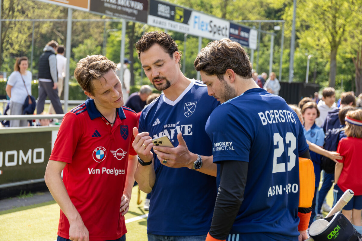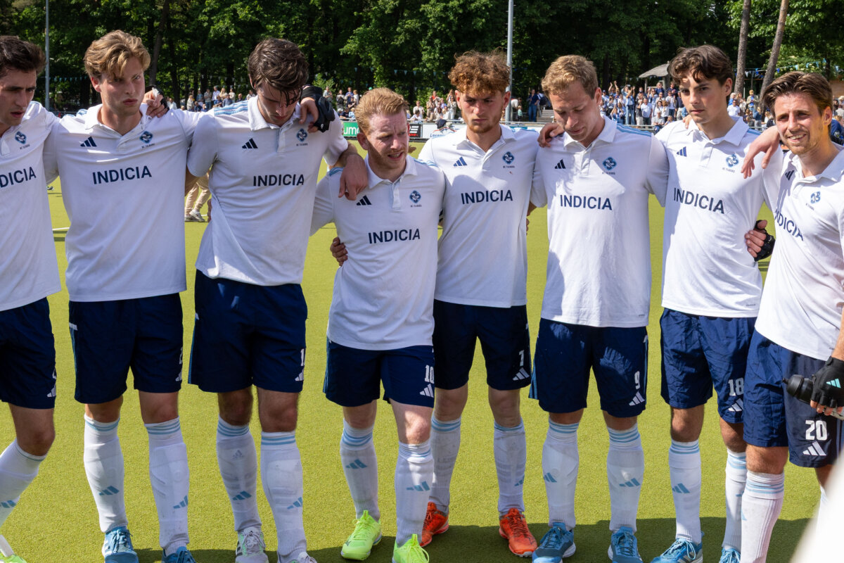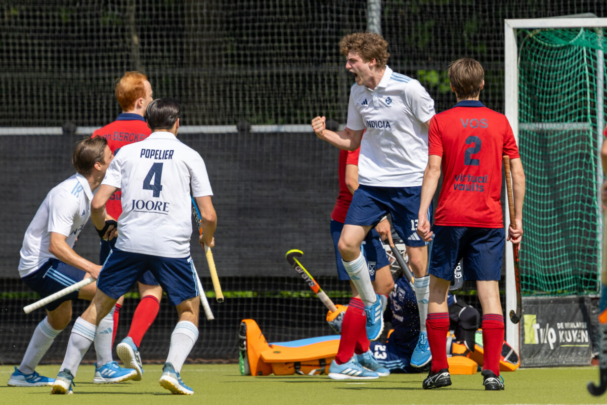 Zelfs na de 3-3 tegen Tilburg staat het Laren van coach Allard van Heemstra nog altijd op polepostion, zien ook Pelle Vos en Joppe Boerstra. Foto: Rogier Balk