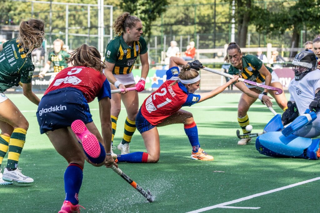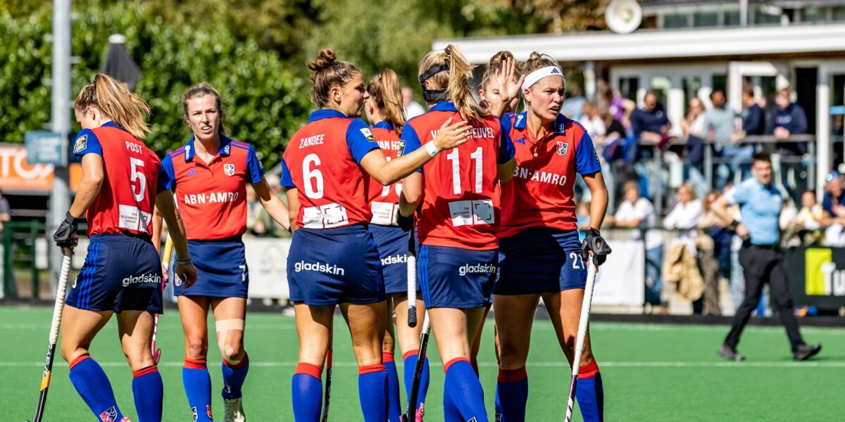 Bloemendaal pakte bij de rentree op het hoogste niveau meteen een punt tegen Pinoké. Na tien minuten openden de bezoekers de score via een rake strafcorner van Sam Luttmer. Een kleine handvol minuten daarna maakte Rosalie Rosman gelijk voor Bloemendaal dat in het tweede kwart op voorsprong kwam via Mijntje van Campen. Lana Kalse voorkwam met een doelpunt uit een rebound van een strafcorner dat Pinoké al op de eerste speeldag met lege handen zou komen te staan.
