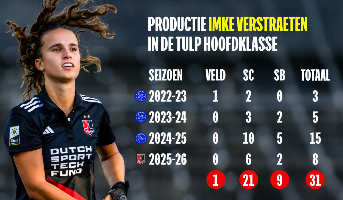 Dat is bijna een understatement. Bij Pinoké legde Verstraeten er vorig seizoen vijftien in. Bij Amsterdam ligt ze op koers om dat persoonlijk record meteen al te verbreken. Na acht wedstrijden staat haar teller dus op acht. Ze is de cornertopscorer van het land die fenomenen als Yibbi Jansen en Frédérique Matla achter zich laat qua productiviteit.
