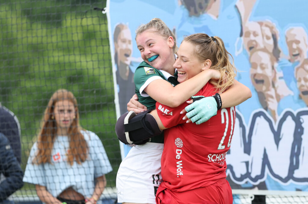 Keepster Julia Remmerswaal krijgt de felicitaties na de gestopte strafbal. Foto: Rob Römer