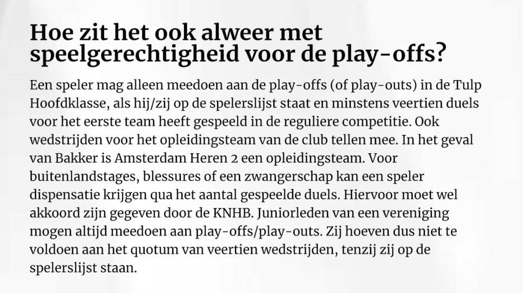 Of het zijn enige optreden als invalkracht is, dat weet Bakker nog niet. Dat hangt natuurlijk van de fitheid af van de Amsterdam-selectie, die toeleeft naar de play-offs. En ook daarin zou Bakker mogelijk zijn opwachting kunnen maken. ‘Ik moet even goed rekenen. Maar ik heb wel een wedstrijd of twaalf gespeeld in het tweede. Dat is een opleidingsteam, dus volgens mij tellen die wedstrijden ook mee voor het eerste. Dus als ik zondag ook speel, heb ik minstens veertien keer meegedaan. Dan mag ik in de play-offs meedoen toch? In theorie?’