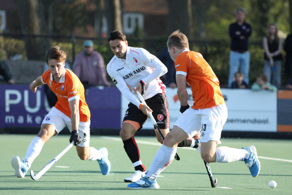 Daarin waren de eerste kansen voor Oranje-Rood, dat meer met de blik naar voren hockeyde. Dat leverde spontaan twee corners achter elkaar op. De eerste inzet van cornerman Sheldon Schouten werd gekraakt, nummer twee werd van de lijn gehaald door Zach Wallace.