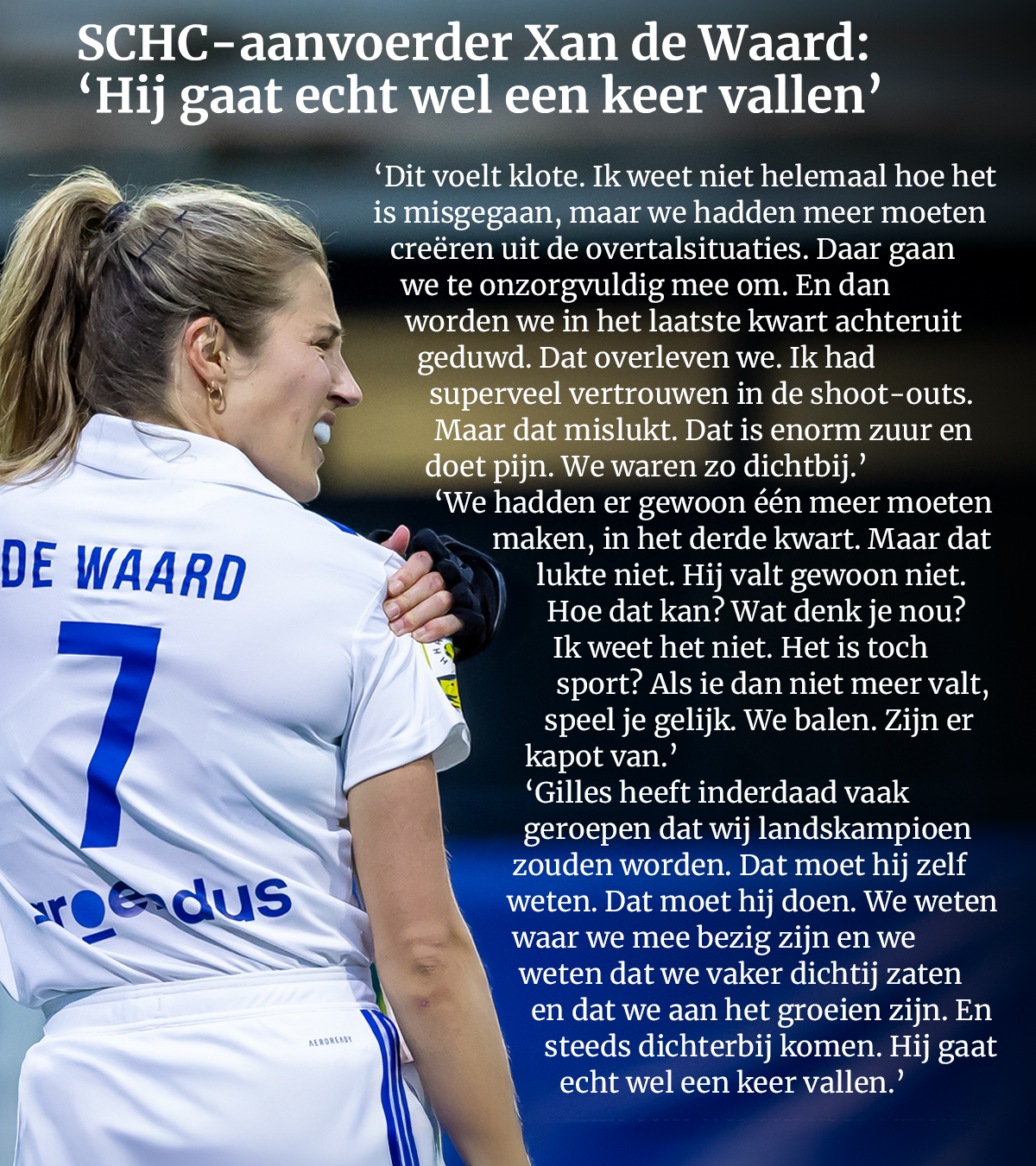De grootste tranen waren er bij verdediger Renée van Laarhoven. Haar gemiste shoot-out deed heel veel pijn. Jongelingen Jip Dicke en Maud van den Heuvel staarden verslagen voor zich uit. Yibbi Jansen wilde de pers niet te woord staan, zoveel zeer deed het. Weer mislukte het voor SCHC. Ook de zesde finale om de landstitel ging de mist in.