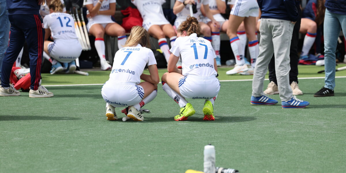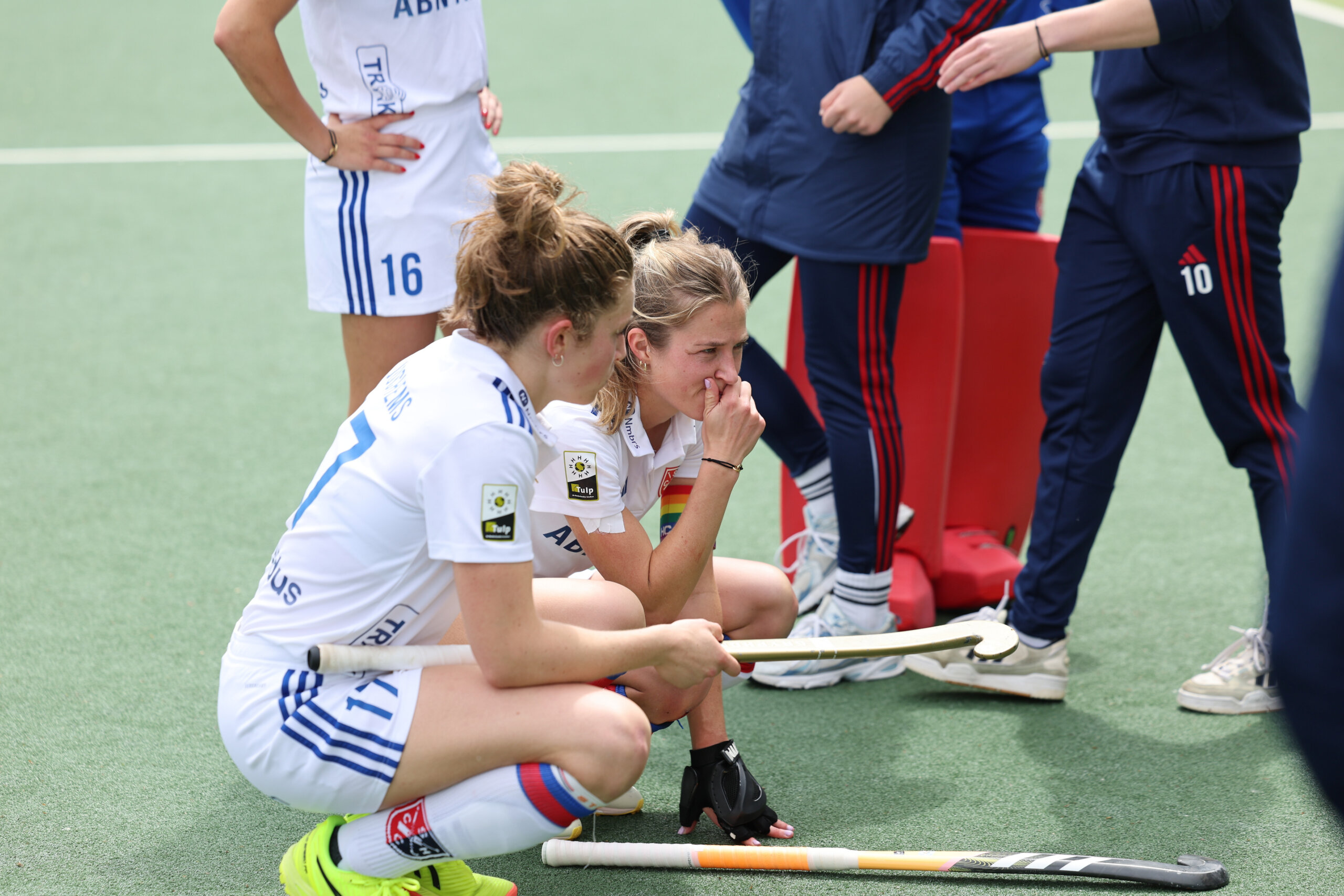 Marleen Jochems en Xan de Waard treuren na het verlies tegen Den Bosch. Foto: Willem Vernes