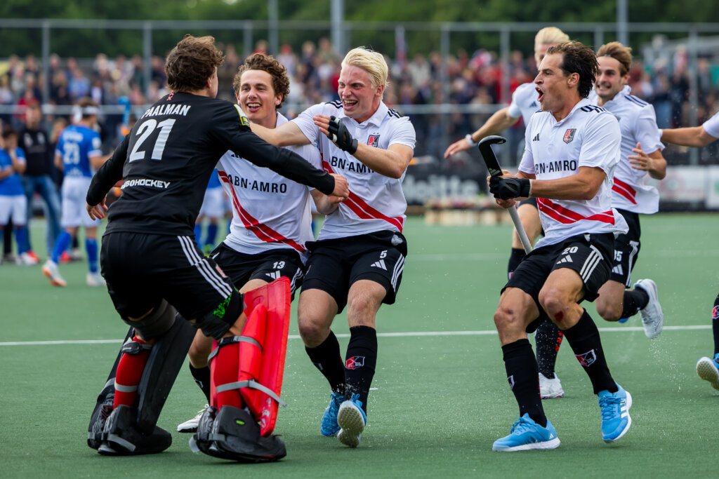 Olivier Paalman wordt belaagd door zijn teamgenoten na de gewonnen shoot-outserie tegen Kampong. Foto: Willem Vernes