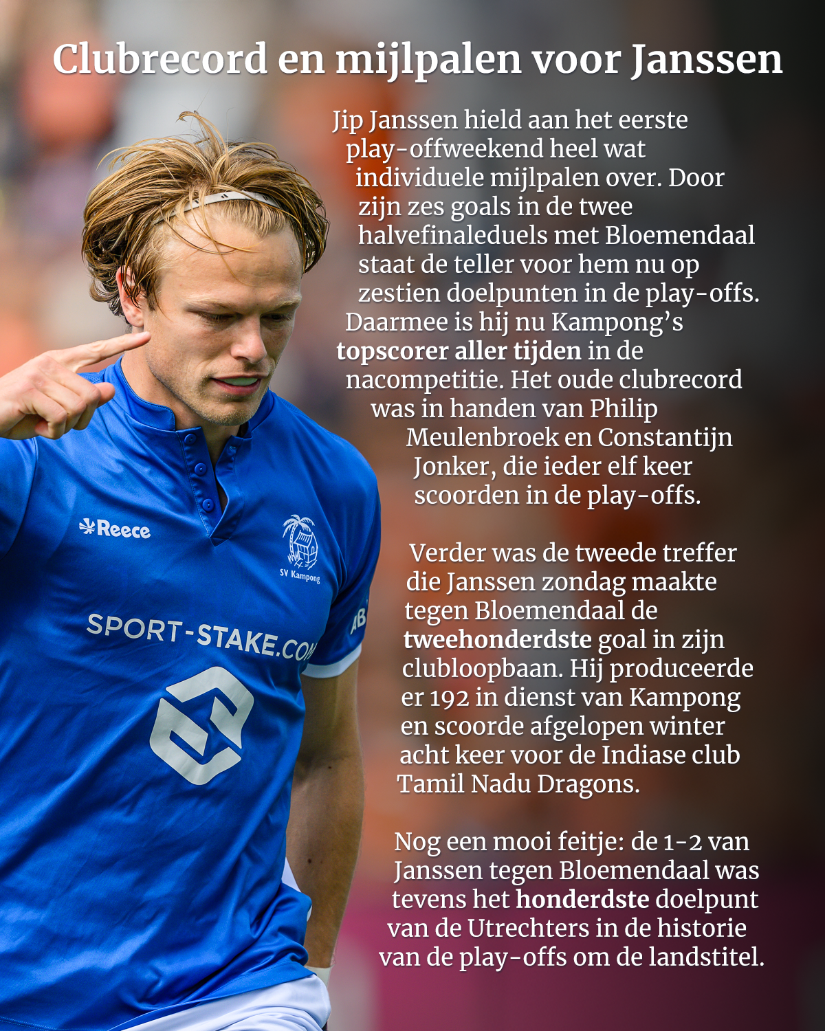 Zes sleeppushes, vier doelpunten. Twee verzilverde strafballen. Strafcornerkanon Jip Janssen (27) van Kampong liet dit weekend in het tweeluik met topclub Bloemendaal opnieuw zien uit welk hout hij gesneden is. Zijn bijdrage was doorslaggevend, al leverde Kampong tegen de titelfavoriet ook een ijzersterke teamprestatie. ‘Ik heb helemaal niet het gevoel dat ik beslissend ben geweest.’