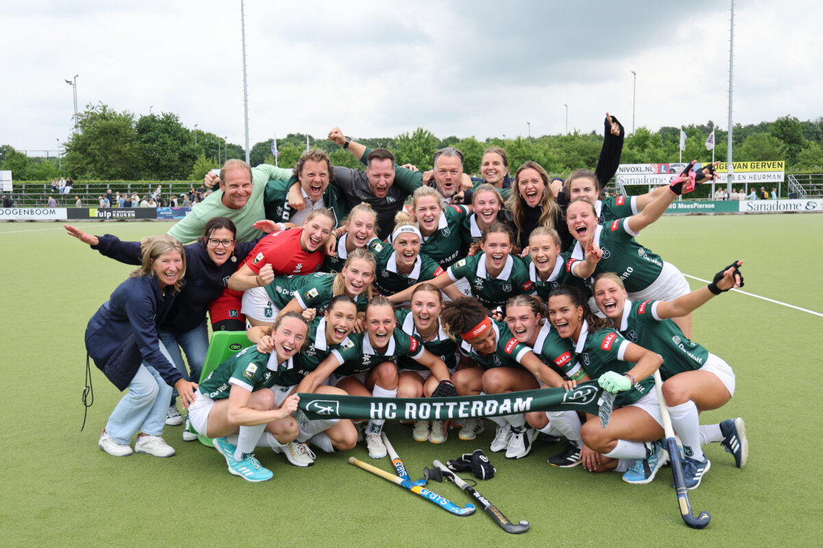 Merel Boekhorst was het stralende middelpunt van de feestvreugde. De 24-jarige verdediger van Rotterdam velde rond 14.00 uur het vonnis door de beslissende shoot-out binnen te pushen. Daarmee hield ze haar ploeg voor het derde jaar op rij in de Tulp Hoofdklasse. De vreugde was groot, maar de opluchting nog groter. Want de Rotterdammers stonden aan de rand van de afgrond.