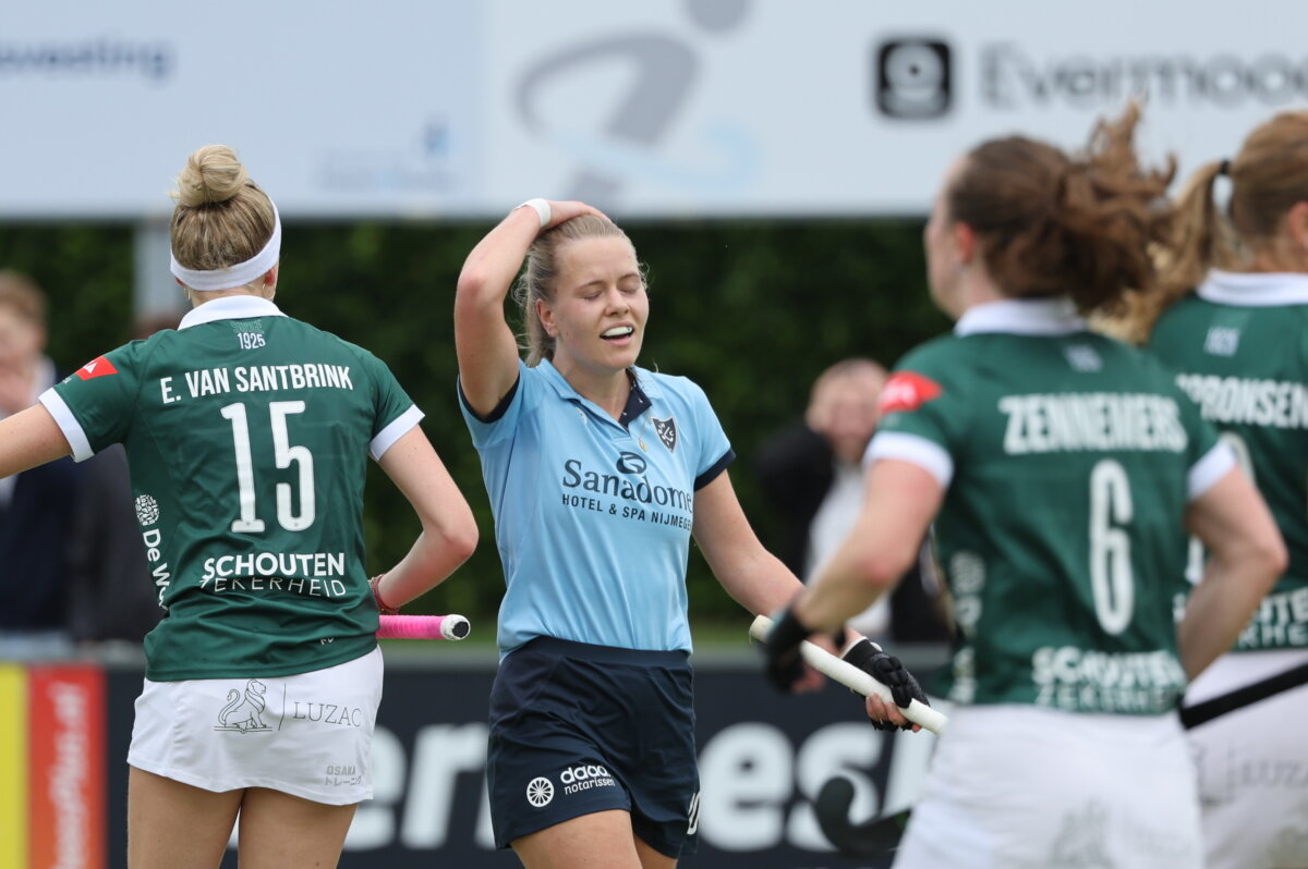 Aan de andere kant van het veld overheerste bij Nijmegen het gevoel van een gemiste kans, maar ook trots. De ploeg van coach Martin van de Rakt poetste de 4-1 nederlaag van zaterdag in recordtempo weg. Al na vier (!) minuten stond het 2-0, dankzij rake klappen van Marjolein Bogers en Sanne Vormeer. Drie minuten voor tijd maakte Louise van Meteren er zelfs 3-0 van, waardoor shoot-outs de doorslag moesten geven.
