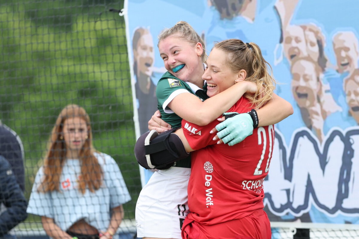 Tessa Verweijen (links) viert één van de drie Nijmeegse doelpunten tegen Rotterdam. Foto: Willem Vernes