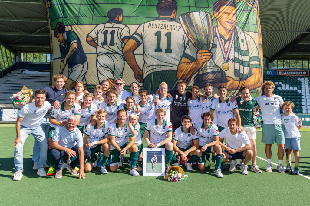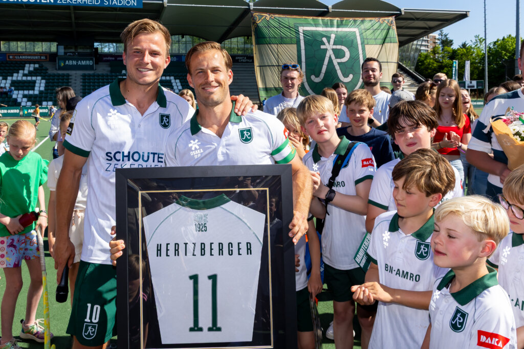 Maar dat was nog niet alles. Twee minuten voor tijd legden de scheidsrechters het spel stil. Niet alleen zijn ploeggenoten, maar ook de spelers van Klein Zwitserland trakteerden Hertzberger op een erehaag. Even later nam voorzitter Jac Bressers de microfoon. De tribune aan de clubhuiszijde gaat voortaan door het leven als de Hertzberger-tribune, maakte hij bekend. Aanvoerder Thijs van Dam had de volgende verrassing in petto: ‘Nooit meer zal een speler van Heren 1 met jouw rugnummer spelen: rugnummer 11.’