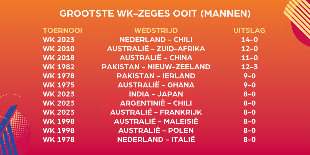 Oranje nam het doelpuntenrecord over van Australië, dat op het WK van 2010 – eveneens in India – korte metten maakte met Zuid-Afrika. Dat duel in de poulefase eindigde in 12-0 voor de Kookaburras, met onder meer vier goals van Luke Doerner en drie van Jamie Dwyer.